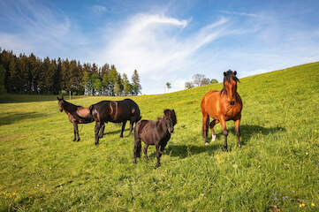 Mit den 36 Hektar bewirtschafteter Fläche legen wir Wert auf extensive Landwirtschaft. Mehr als 90 % davon sind Grünland. Die übrige Ackerfläche verwandeln wir mit der entsprechenden Aussaat von Blühmischungen jedes Jahr zu einem wahren „Insektenparadies“. Besonderheiten in unserem Tal sind die verhältnismäßig arteinreichen Blütenpflanzenbestände. Ein außergewöhnlich üppiger „Märzenbecherteppich“ zeigt sich bereits nach den ersten Sonnenstrahlen im Frühjahr und lässt dabei alle Herzen höher schlagen.