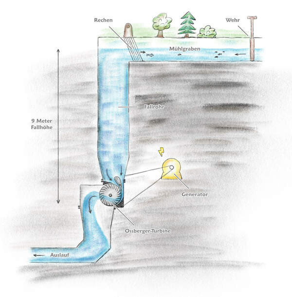 In der Körnermühle kommt eine Ossberger-Turbine zum Einsatz. Durch die Einteilung in 2 Kammern (je 1/3 und 2/3) hat sie einen hohen Wirkungsgrad auch bei stärkeren Schwankungen des Flusspegels. Unser Mühlgraben misst im Oberlauf und Unterlauf je fast eine Länge von 400m. Die Fallhöhe beträgt ca. 9 Meter.
