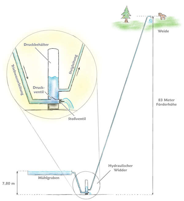 Der Schweizer Fritz Zbinden hat sich fast sein ganzes Leben mit dieser Technologie beschäftigt. Eine seiner wenigen Anlagen in Deutschland wurde hier in der Körnermühle 2013 installiert. Bei unserer Anlage hat das zuführende Fallrohr eine Höhe von 7,80 Metern über der Widderpumpe. Sie hebt von dort das Wasser die entsprechende Höhenmeter an.